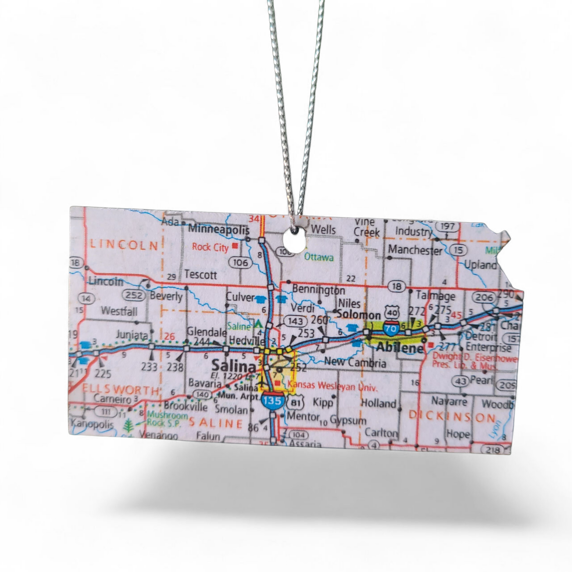 ◦ 2006 Kansas map overlaid on 1/8" white birch cut out in the shape of Kansas.