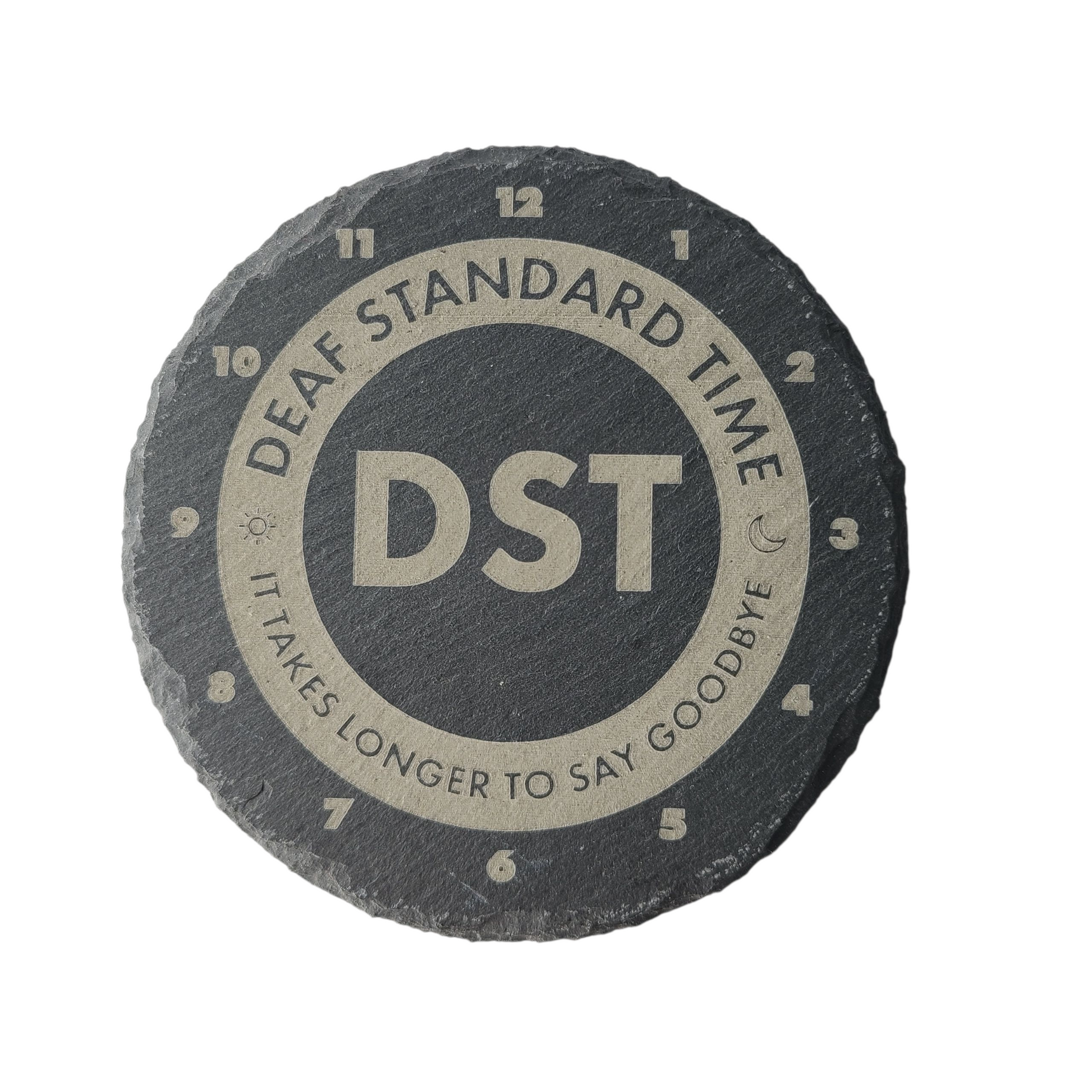 - 1 round slate stone coaster with "Deaf Standard Time" clock engraved.