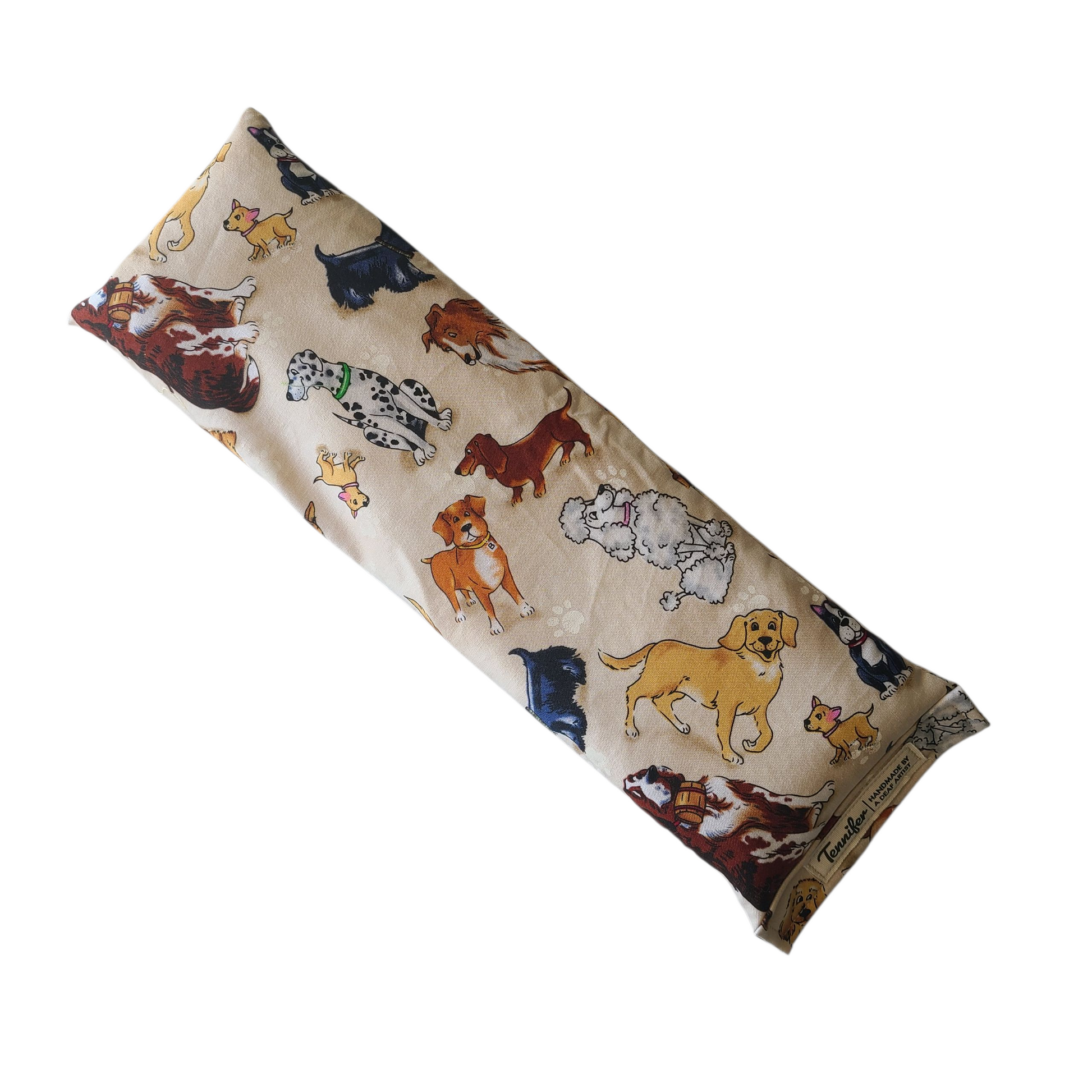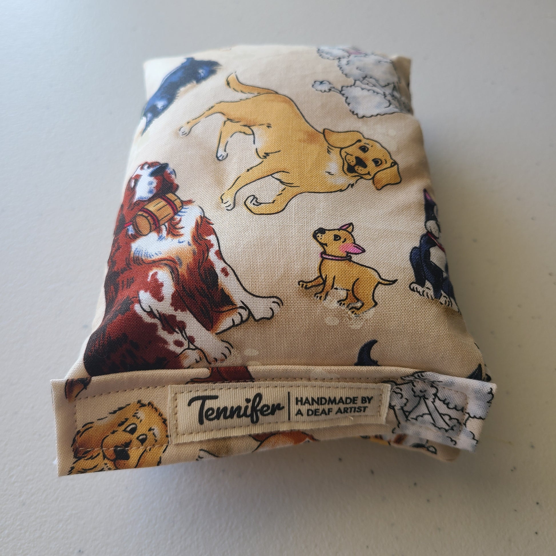 Fabric description: Cream background showing different dog breeds (Saint Bernard, Scottish Terrier, Chihuahua, Golden Retriever, Poodle, Boston Terrier, Dachshund, Cocker Spaniel, Boxer, Dalmatian, Collie). Accent colors are brown, white, gray, black, green, pink, and blue.