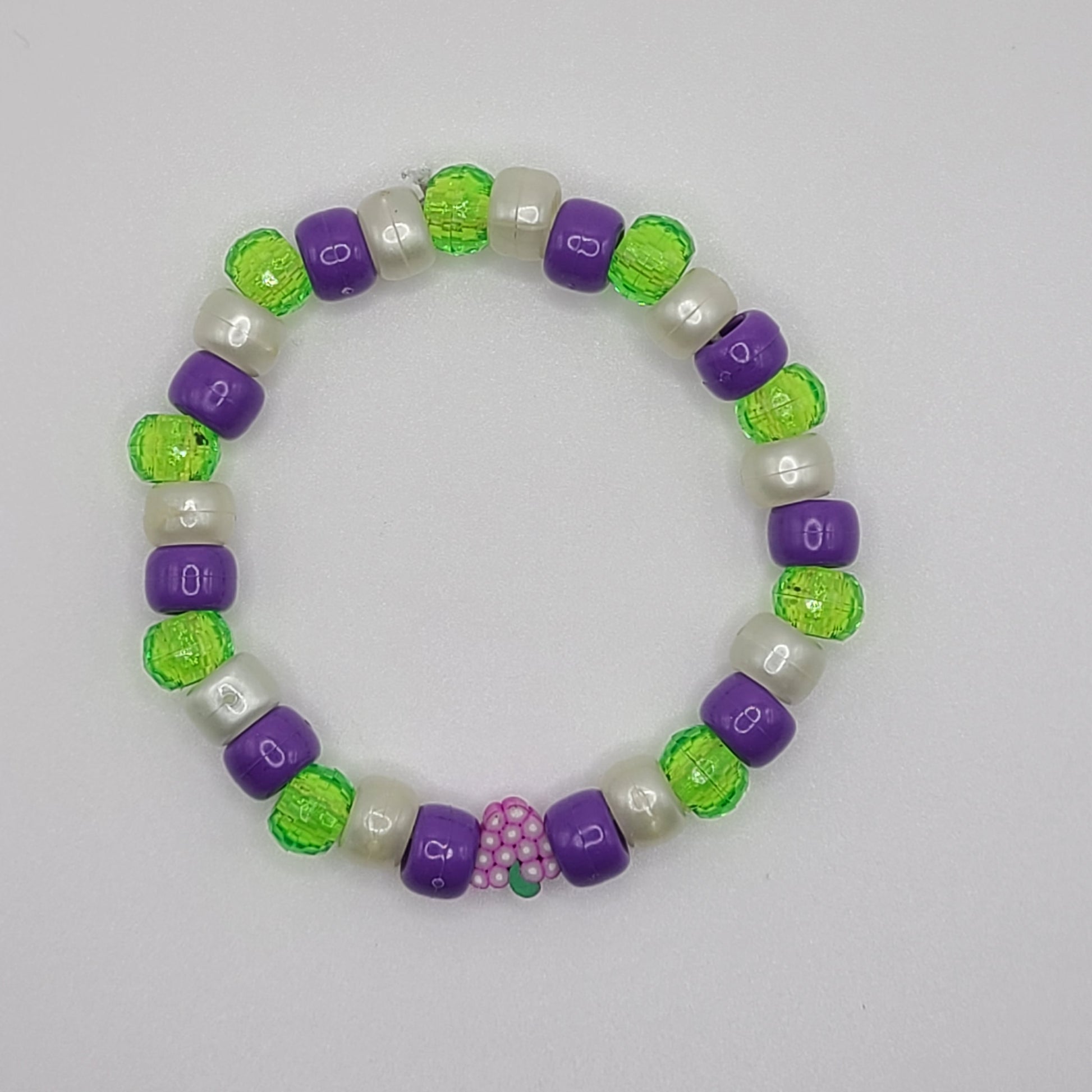 - pony bead bracelet with varying shades of purple, green and white beads with one grape bead.