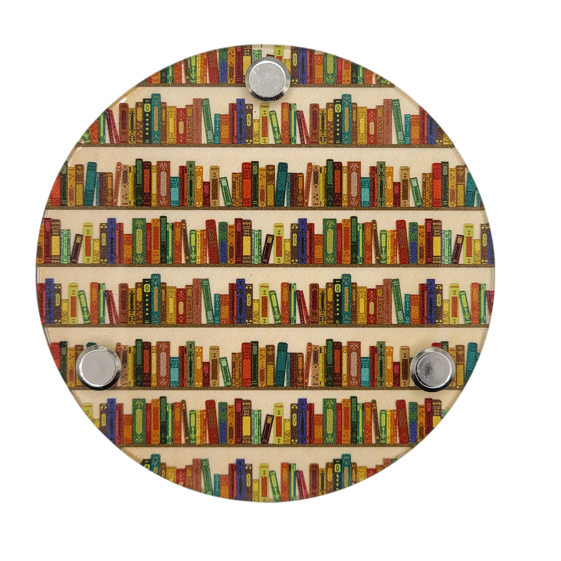 - This coaster has 3 layers: top layer is clear acrylic with books and shelves printed on the back, middle layer is basswood, bottom layer is cork.