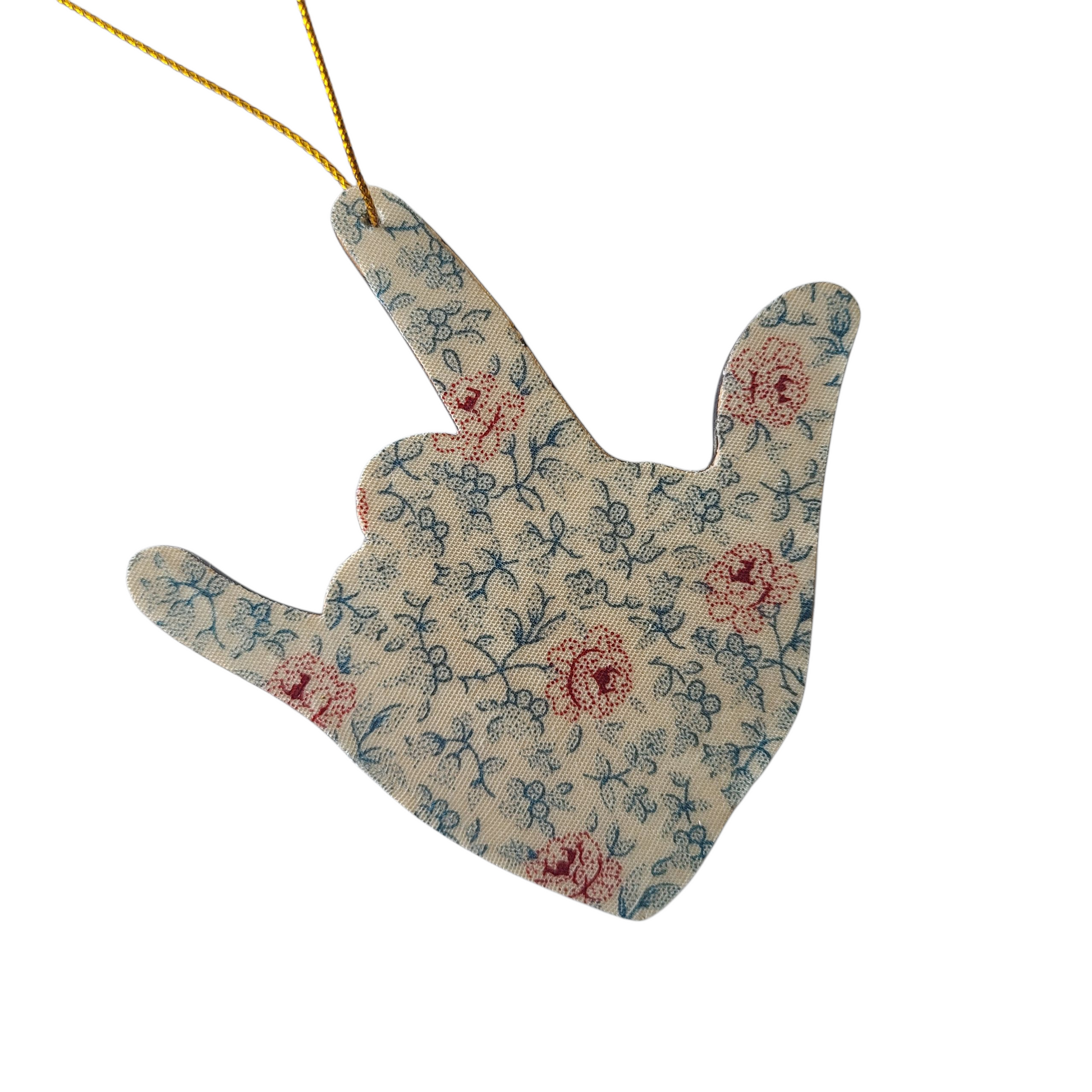 - The back side is made of fabric with a calico pattern of red roses and blue leaves against a cream background