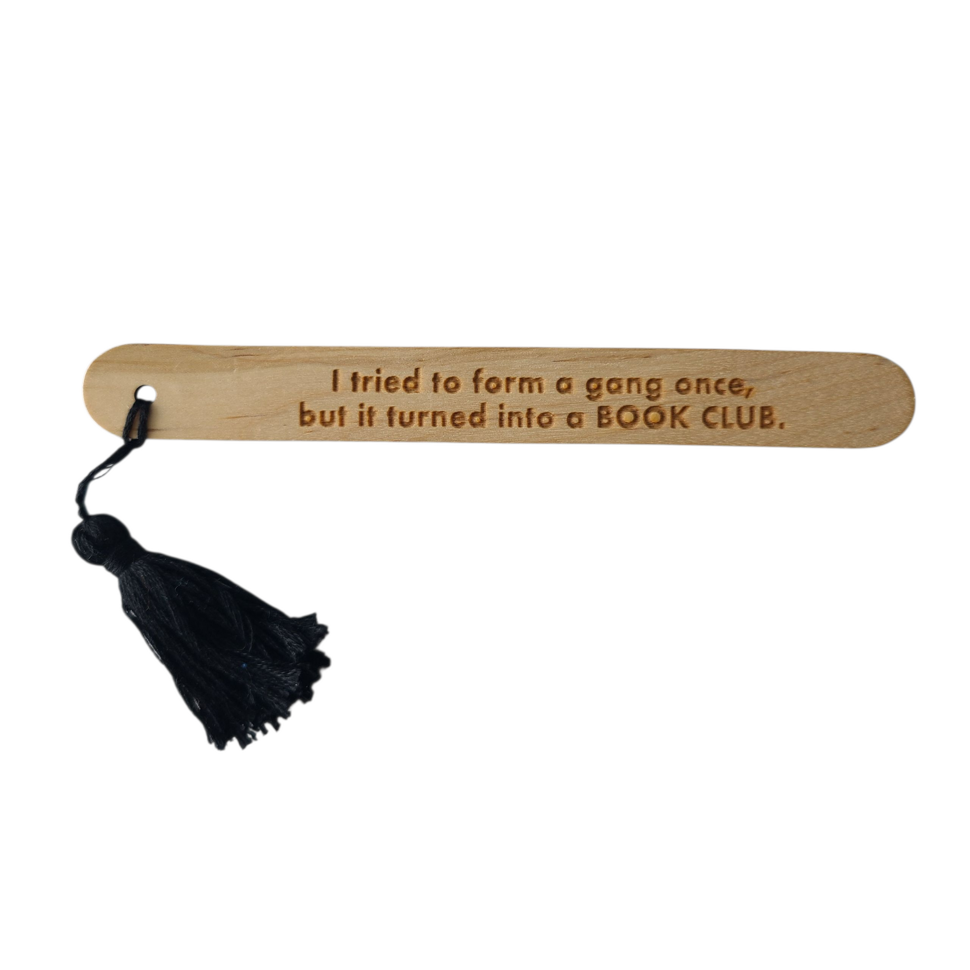 - The text "I tried to form a gang once, but it turned into a BOOK CLUB." is engraved on a popsicle stick on one side.