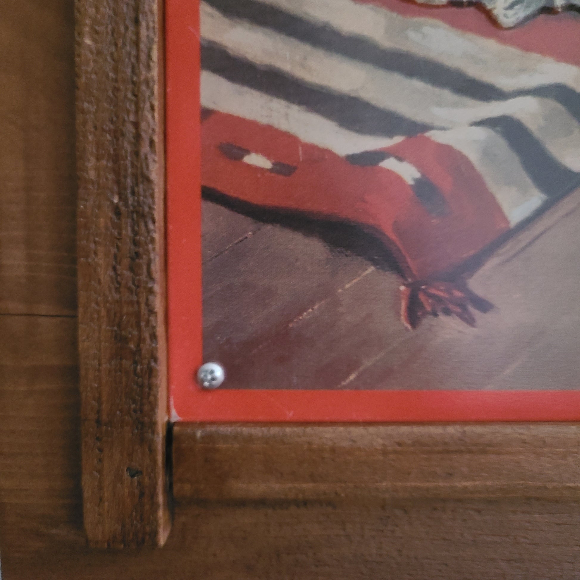 - The tin sign is mounted on several wooden strips within a wooden frame.
