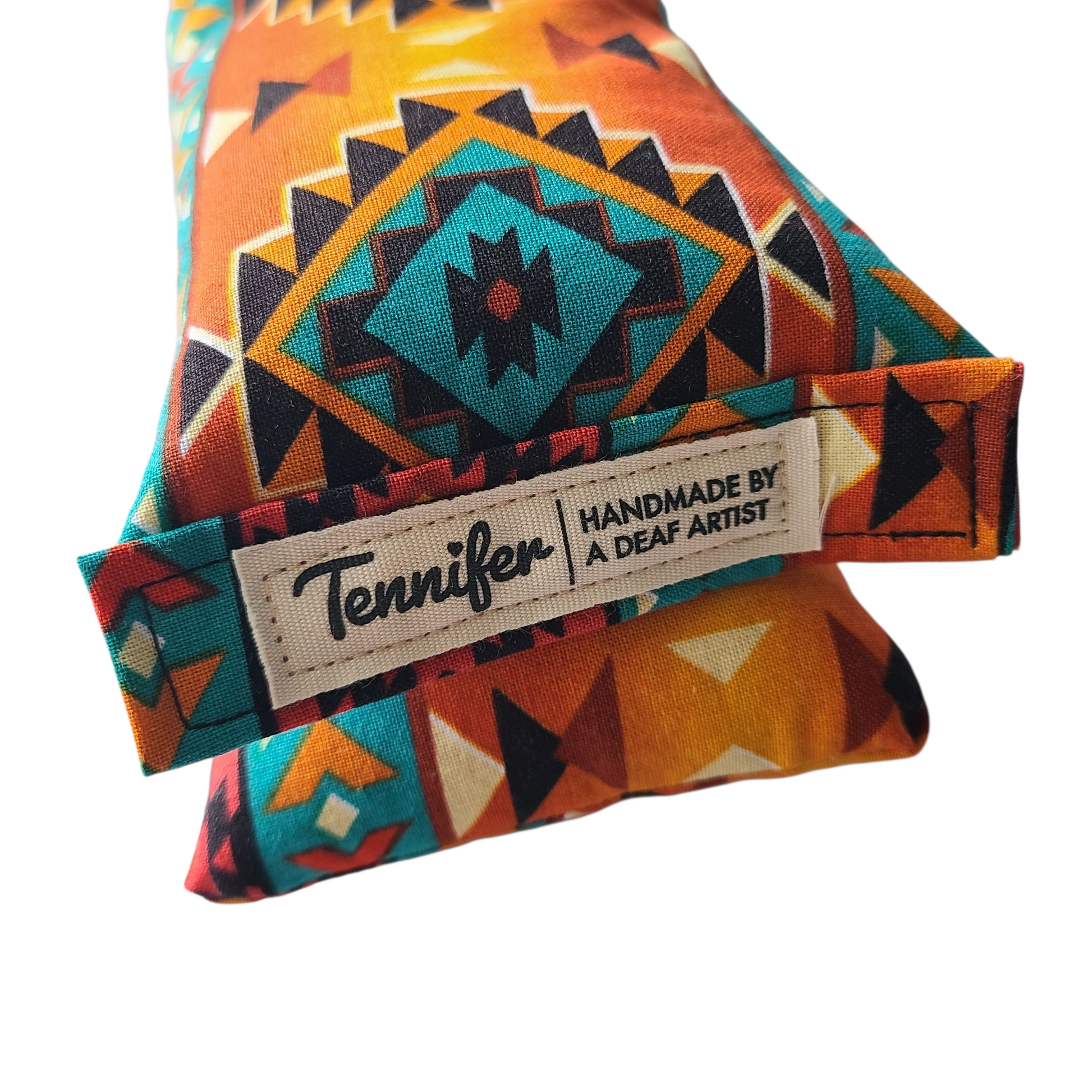 Fabric description: Orange background with a southwest pattern using teal, brown, cream, and black colors.